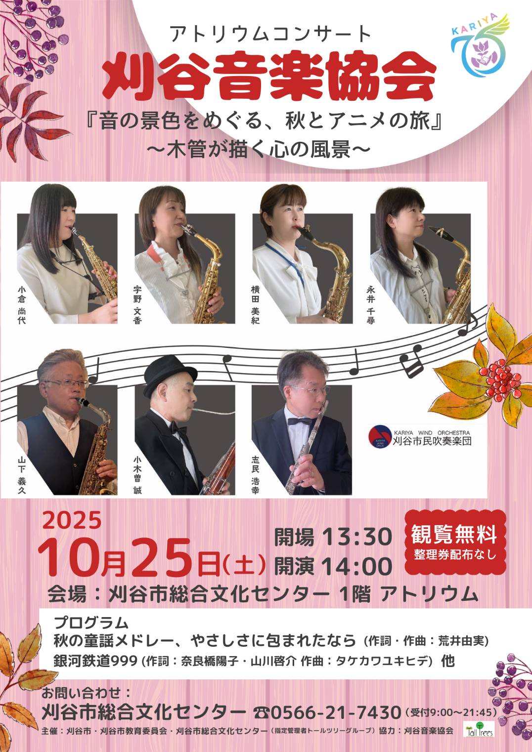 『音の景色をめぐる、秋とアニメの旅』 木管が描く心の風景 場所:刈谷市総合文化センター1階 エントランスアトリウム 出演:刈谷市民吹奏楽団(小倉尚代、宇野文香、横田美紀、永井千尋、山下義久、小木曽誠、志民浩幸) チラシはこちら |