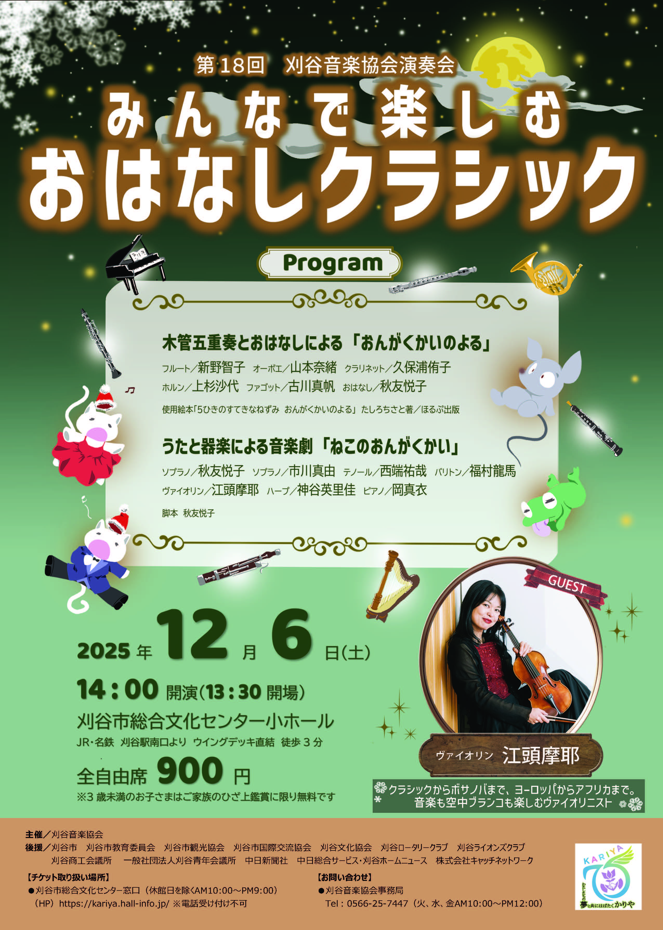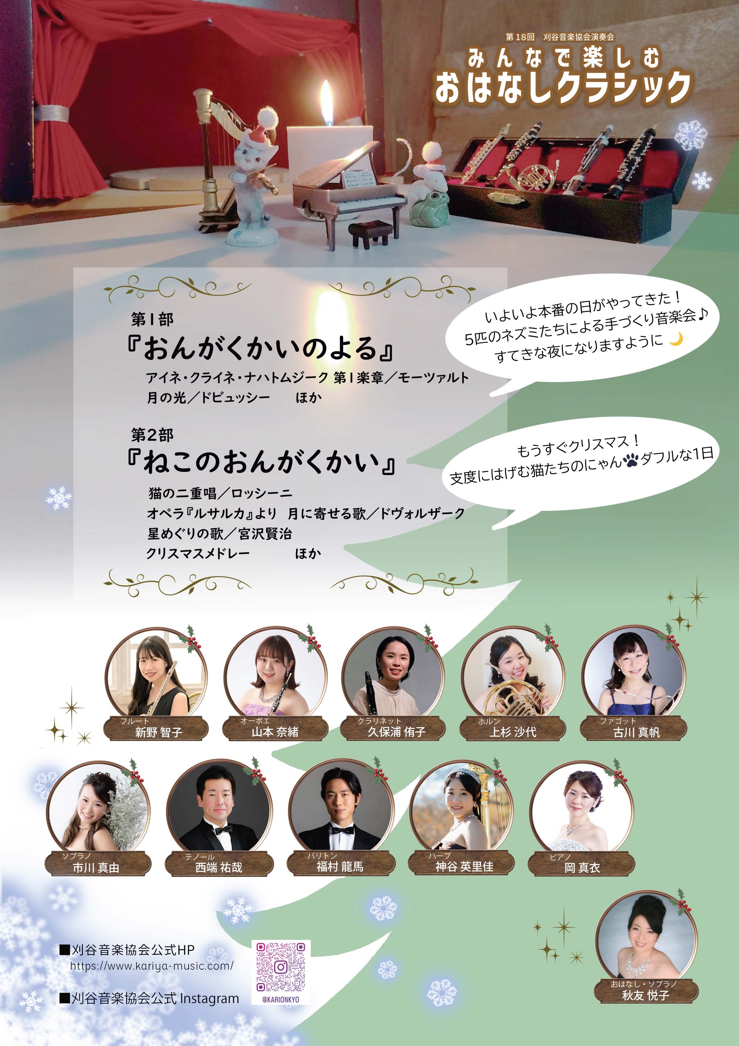 第18回刈谷音楽協会演奏会 『みんなで楽しむおはなしクラシック』 ●ゲスト 江頭摩耶(ヴァイオリン) ●木管五重奏 新野智子(フルート)、山本奈緒(オーボエ)、久保浦侑子(クラリネット)、上杉沙代(ホルン)、古川真帆(ファゴット) ●声楽 秋友悦子(ソプラノ)、市川真由(ソプラノ)、西端祐哉(テノール)、福村龍馬(バリトン) ●器楽 岡真衣(ピアノ)、神谷英里佳(ハープ) チラシ1はこちら チラシ2はこちら |